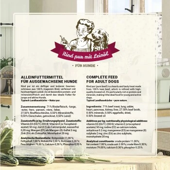 Der Fleischanteil liegt bei 71 %, hinzukommen lediglich Fleischbrühe, hochwertiges Leinöl, wichtige Mineralstoffe und getrocknete Eierschalen, die die optimale, natürliche Kalziumversorgung gewährleisten.