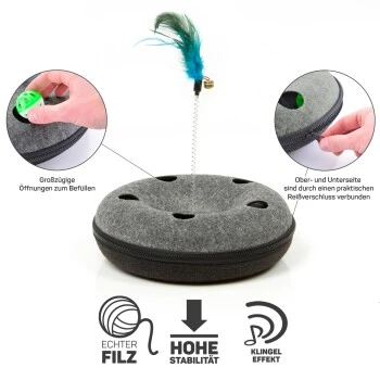 Katzen lieben es zu spielen und spielen ist wichtig für die Gesundheit jeder Katze, egal in welchem Lebensabschnitt sie sich befinden. Das Katzenspielzeug Sputnik sorgt dafür, dass Ihre Katze durch ein instinktives Spielen geistig scharf und unterhalten bleibt. Diese Art des Spiels und der Übung, auf die Ihre Katze am besten reagiert und ihr am meisten Spaß bereitet. Es kann nicht nur der Ball im Inneren gejagt werden, sondern auch die die Feder an dem mittig angebrachten zurückfedernden Stab.