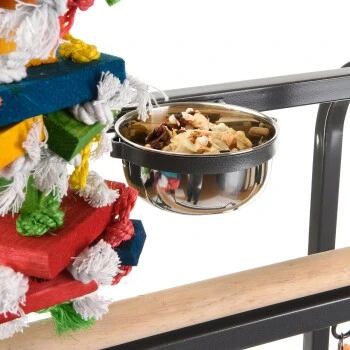 Die Leitern bieten viele Klettermöglichkeiten zu den einzelnen Holzsitzstangen. Ein weiteres Nachfolgemodell unserer altbewerten Papageien Freisitze. Inklusive Sitzstangen, zwei Edelstahlnäpfen, Auffangschürze, entfernbarem Kotgitter und drei Leitern. An diversen Ösen können Sie schöne Spielzeuge befestigen.