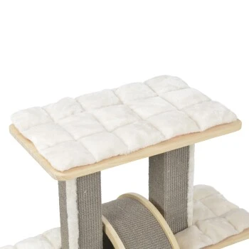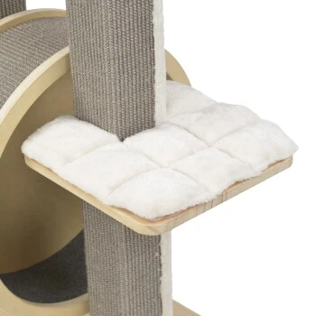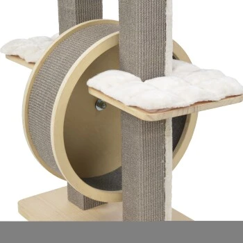 Der MORE Kratzbaum Camilla sticht insbesondere durch sein großes Kratzrad hervor, das viel Abwechslung bei der täglichen Krallenpflege bietet und für großen Beschäftigungsspaß sorgt. Auf zwei verschiedenen Ebenen findet Ihr Stubentiger ausreichend bequeme Liegeflächen, deren kuschelige Liegekissen sich ganz einfach abnehmen und bei 30° waschen lassen. Der Kratzbaum überzeugt außerdem durch seine außergewöhnlichen Kratzstämme in quadratischer Form, die mit hochwertigem grauen Sisal versehen sind und so langfristigen Kratzspaß gewährleisten. Gefertigt aus umweltfreundlichem Kiefernholz, ist der MORE Kratzbaum Camilla nicht nur sehr stabil und langlebig sondern bietet selbst größeren Katzen eine Ruheoase zum Entspannen, Beobachten und Kratzen.