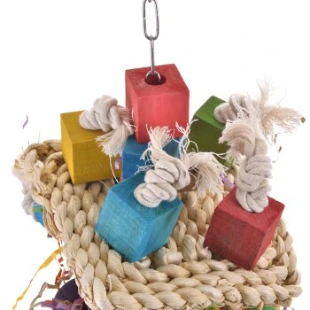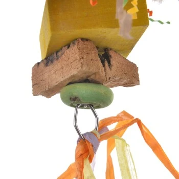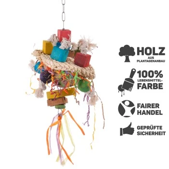 Es besteht aus einer halben Kokosnuss gefüllt mit bunten Papierstreifen. Eine Maisstrohmatte schließt die Kokosnuss nach oben als Deckel ab. Eine zusätzliche Verzierung und doppelten Knabberspaß bieten die Baumrindenstücke, Baumwollseile und Holzteile.